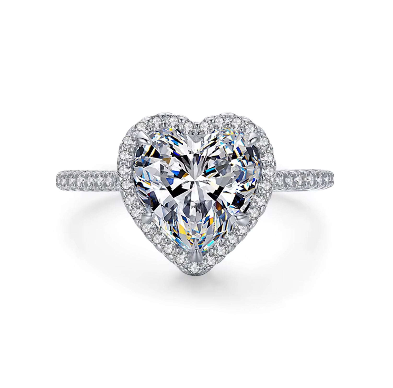 This romantic statement piece showcases a bold heart-shaped center stone, surrounded by a fully iced halo of VVS moissanite diamonds in D-Color (colorless) for maximum fire and sparkle. Each stone is meticulously hand-set and diamond-tester approved, delivering the look and brilliance of fine diamonds with unmatched clarity.